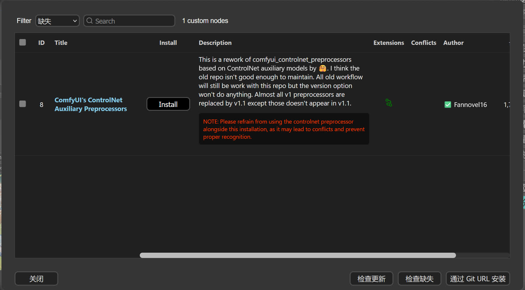 在界面中可以看到 ComfyUI-Manager 搜索出来的缺失节点,点击 Install 后重启 ComfyUI 使扩展生效。
