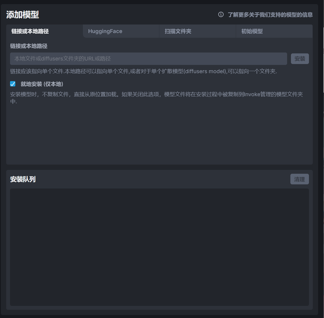 在链接或本地路径选项支持使用模型的下载链接或者模型的本地路径添加模型到 InvokeAI 中,如果使用链接下载模型,请确保模型的下载链接为直链。