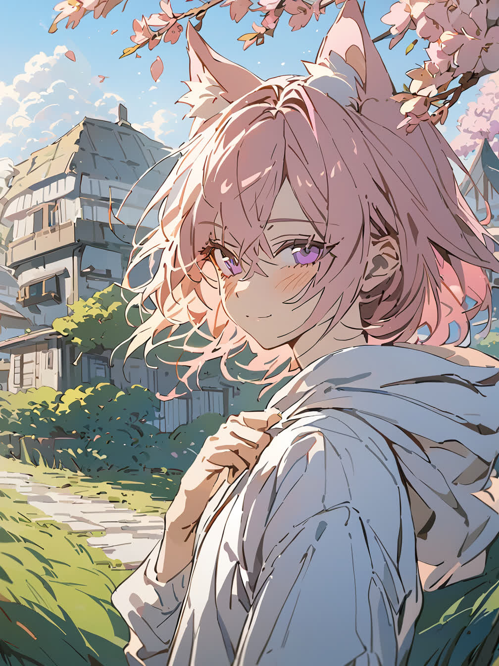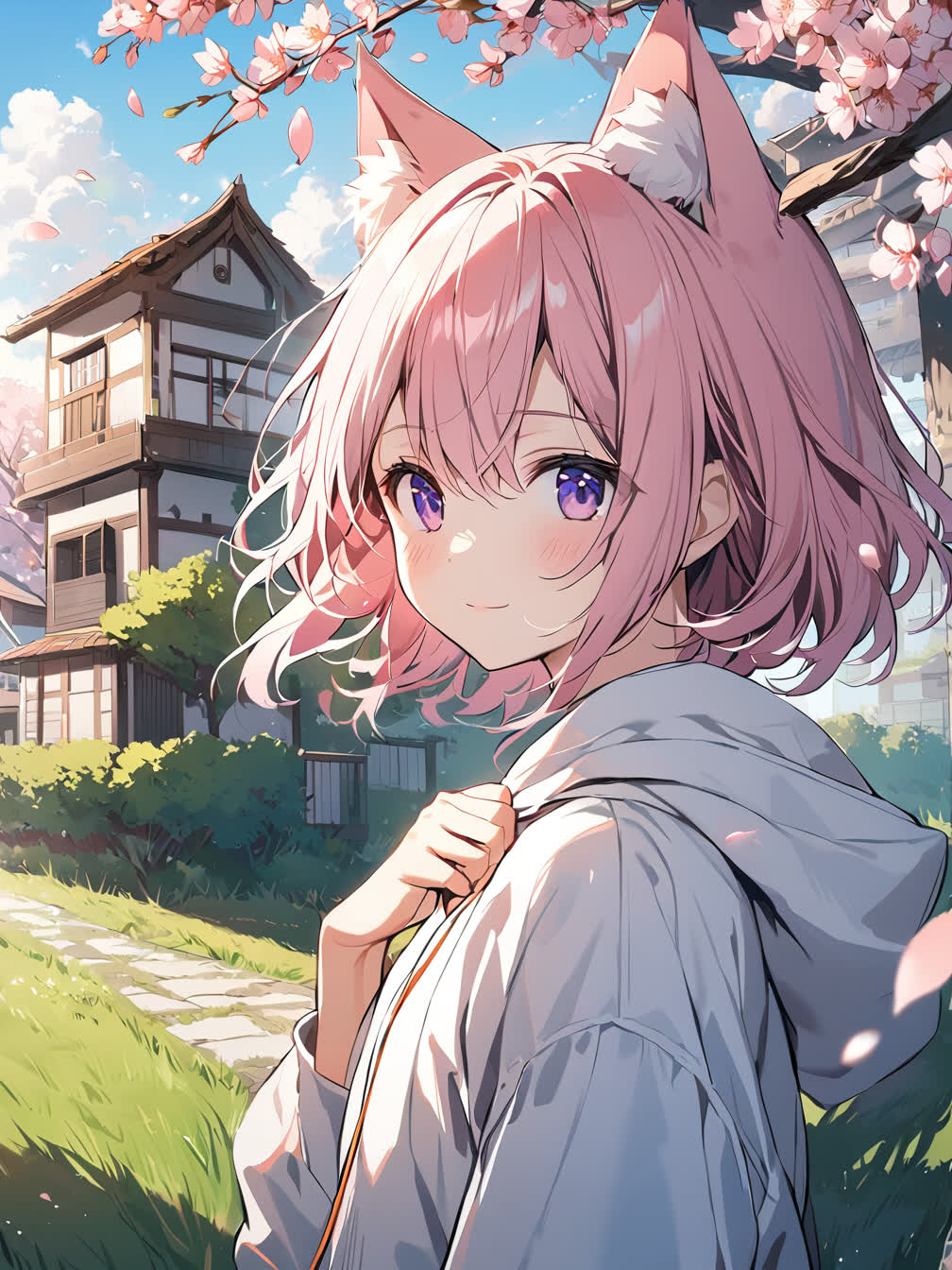 1girl,animal ears,animal ear fluff,cat ears,pink hair,short hair,bangs,blush,closed mouth,light smile,purple eyes,hair between eyes,white hoodie,flat chest,