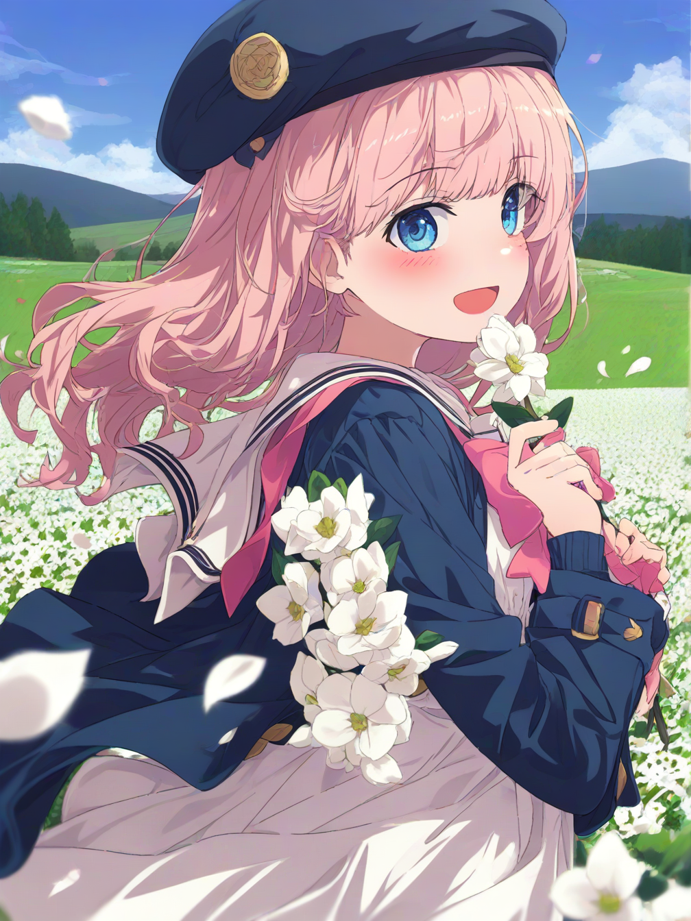 1girl,solo,long hair,pink hair,bangs,blue eyes,blush,sailor collar,pink bow,long sleeves,dress,white dress,jacket,blue jacket,blue headwear,bow,open clothes,hair flower,hair ornament,head wreath,