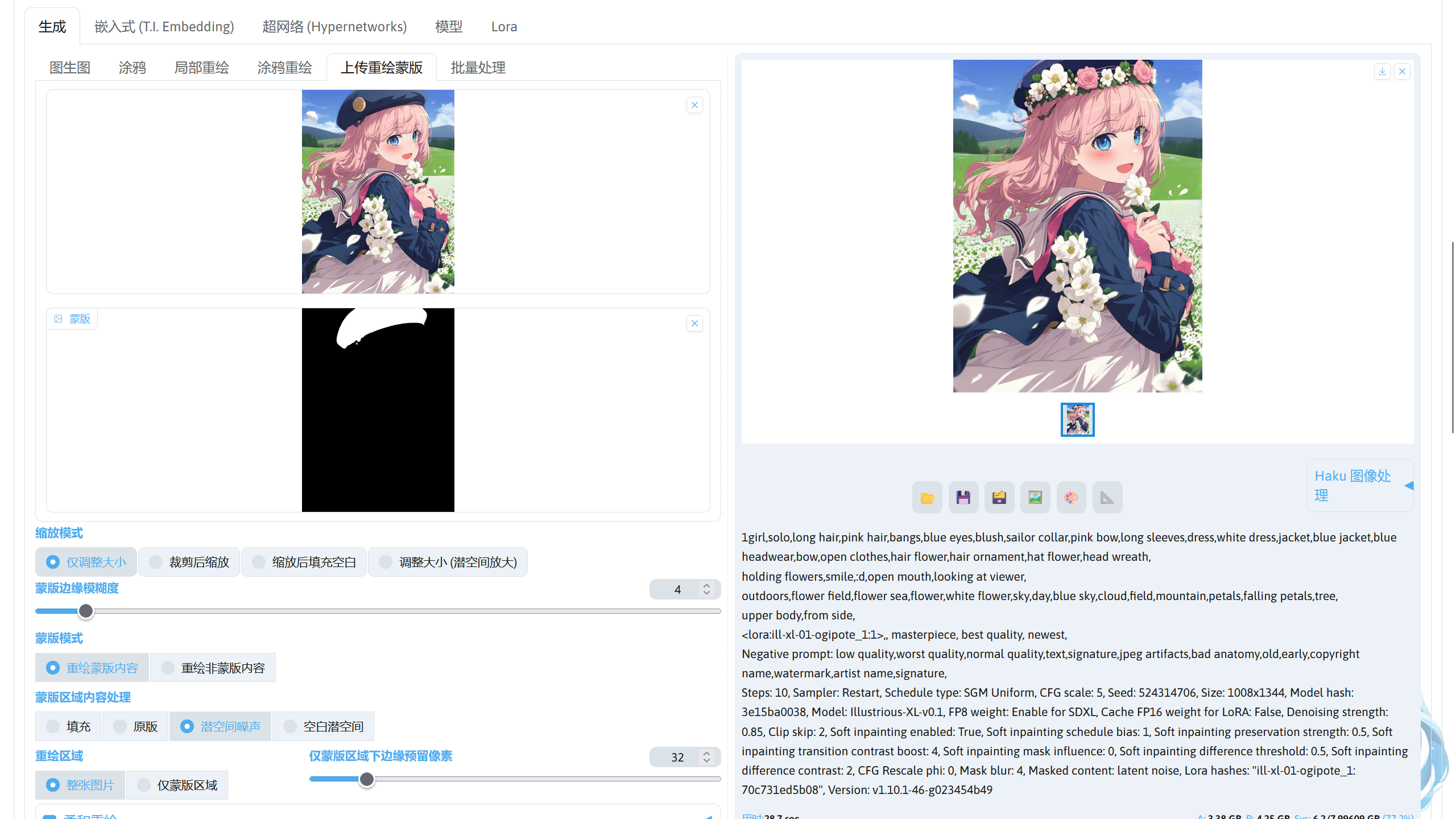 仅蒙版区域时,SD WebUI 将会把包含蒙版部分的区域裁剪下来进行图生图,再将图片拼接回去,因为 AI 参考的图片部分由图片的整体变为了局部,可能会导致重绘部分和非重绘部分的衔接不是很好。而且使用仅蒙版区域时描写图片的提示词需要改写成描写蒙版部分而不是整张图片,不然可能会导致重绘区域出现不好的效果。但是使用仅蒙版区域时,对图片中人物的眼睛,手之类的区域会有更好的效果。