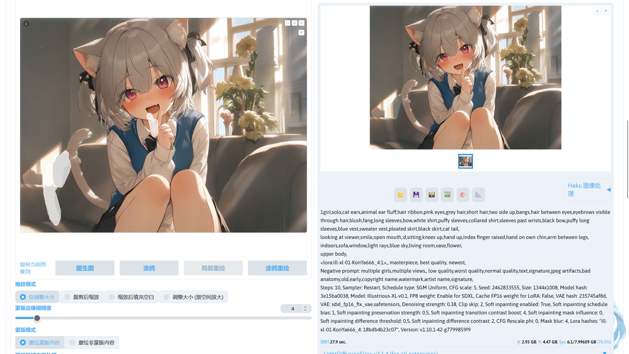 图生图需要将原图反推为潜空间数据,因此占用会比文生图更高,并且参考图尺寸越大占用越高。对于局部重绘,占用会比单纯图生图再略高,但这并不意味着低显存就不能局部重绘,实际上只要采用将重绘区域裁剪下来的方法就可以实现低显存重绘。并且由于图生图会经过两次 VAE,在使用 VAE 异常的模型时,每次重绘都会导致画面变得更灰,反复迭代将灰到不能看,最好保持外挂 VAE。