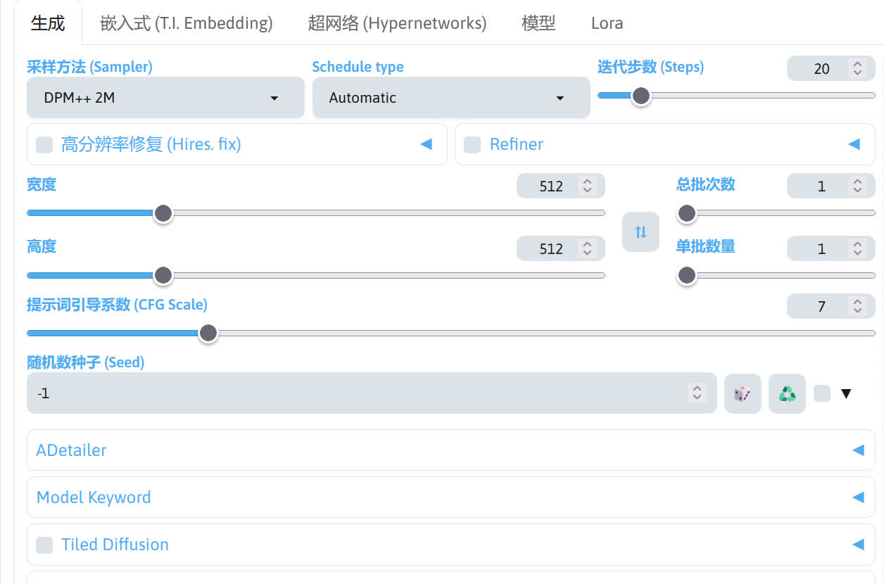 | 采样方法(Sampler) | 调度器(Schedule type) | 迭代步数(Step) |