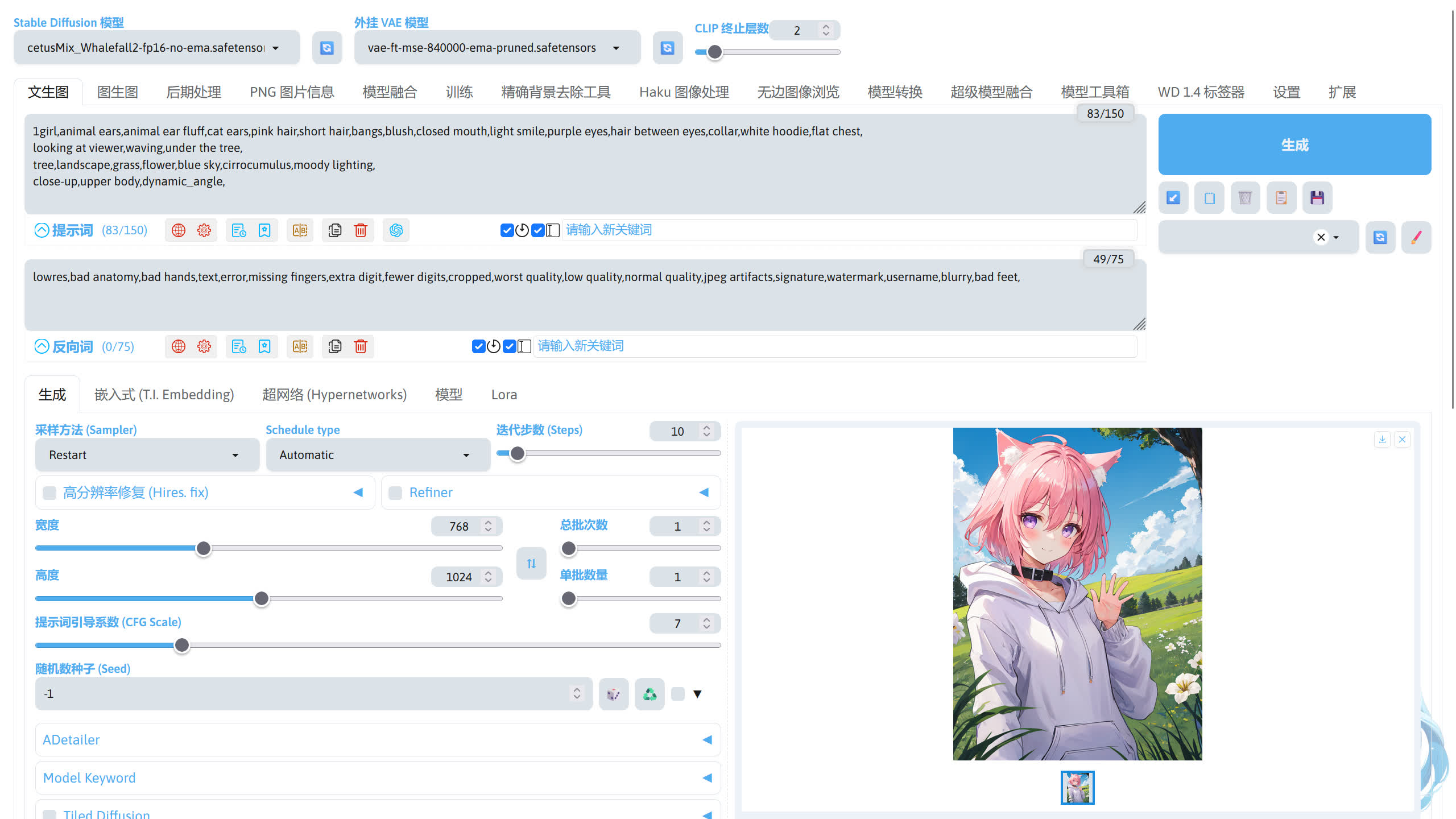 现在我使用的 cetusMix_Whalefall2 模型为 SD 1.5 的模型,适合的分辨率范围为 512 ~ 1024,所以我把宽度和高度分别设置为 768 和 1024。